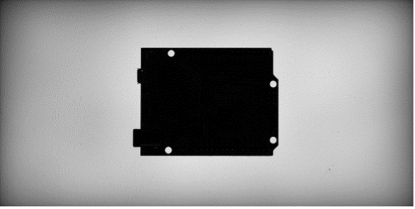 Table 1 features images taken with fixed focal length lenses and illuminated with a backlight. It is evident from the images that a backlight is ideal for creating a silhouette of an object. This is great for objects that are not transparent like the cap (Panel B), gear (Panel D) and PCB board (Panel E). The text on the shipping label (Panel C) cannot be detected with this type of illumination geometry, making it a poor choice for optical character recognition (OCR) applications. When imaging transparent glass objects like the medicine vial in Panel A, a backlight can be used to look at liquid levels or placement of the label. Overall, this type of illumination is ideal for edge detection or part verification, since it creates a clear difference in gray level intensity between object and background.