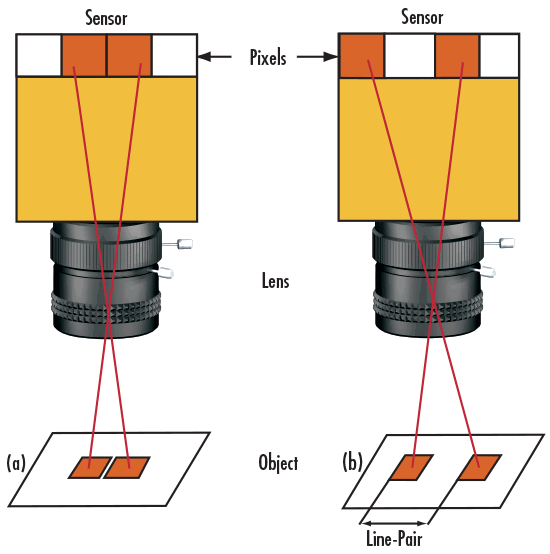 Une manière pratique de comprendre les paires de lignes consiste à les considérer comme des pixels sur un capteur de caméra, où une seule paire de lignes correspond à deux pixels (Figure 2). Deux pixels de capteur de caméra sont nécessaires pour chaque paire de lignes de résolution : un pixel est dédié à la ligne rouge et l’autre à l’espace blanc entre les pixels. À l’aide de la métaphore précédemment citée, la résolution d’image de la caméra peut désormais être spécifiée comme égale à deux fois sa taille en pixel.